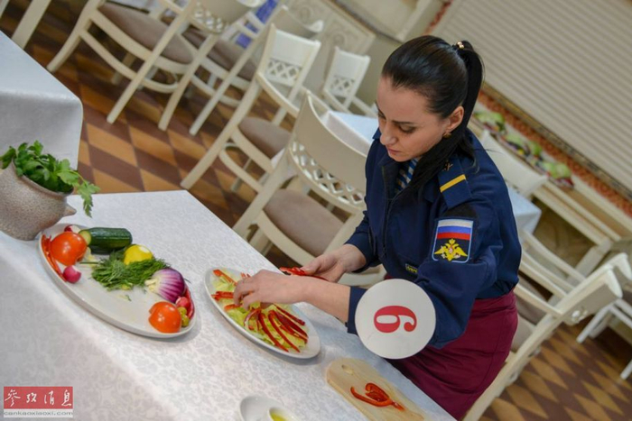 正在精心准备菜肴的俄军女兵。