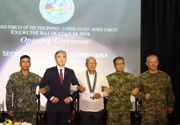 菲律宾国防部长洛伦扎纳、美国驻菲律宾大使金成以及军演美菲两军指挥官的合(图源:国际在线)