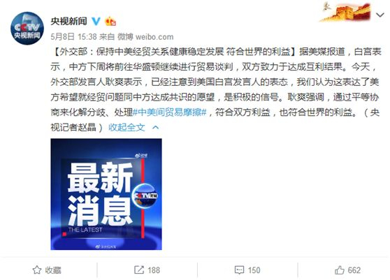 而据央视的最新消息,据美媒报道,白宫表示,中方下周将前往华盛顿继续进行贸易谈判。双方致力于达成对双方都有利的结果,外交部也做出回应:保持中美经贸关系健康稳定发展 符合世界的利益: