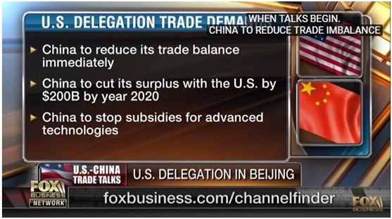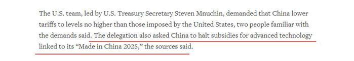 福克斯主持人在播报时重点强调了第三点,即美国要让中国停止对自己的先进技术进行补贴。对此,路透社也援引消息人士的话称,美国要求中国立即停止向“中国制造2025”计划涉及的高新技术领域提供补贴或其他支持。