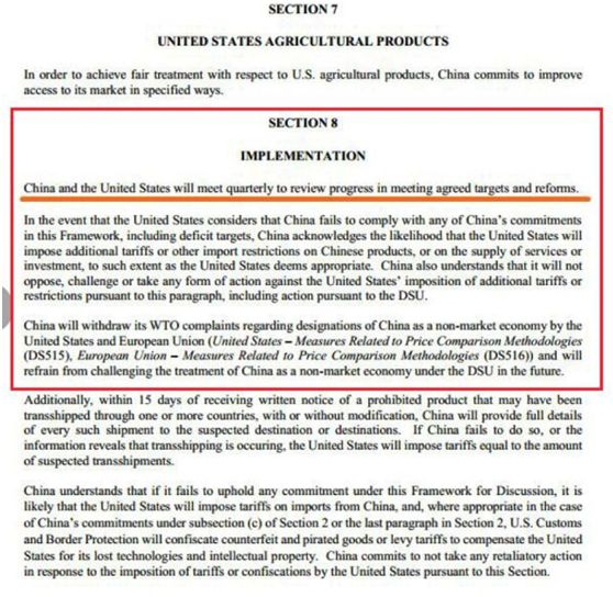 而除了上述条件外,前不久被《华尔街日报》曝光的“条件清单”中还包括了中国必须按照美国的要求开放市场给美国,必须大量购买美国产品,以及不得要求美国企业转让技术给中国等等“八项要求”。甚至美国提出如果觉得中国不配合,可以立刻用关税制裁中国,但中国不得反击,不能对美国产品加关税,只能废除关税……