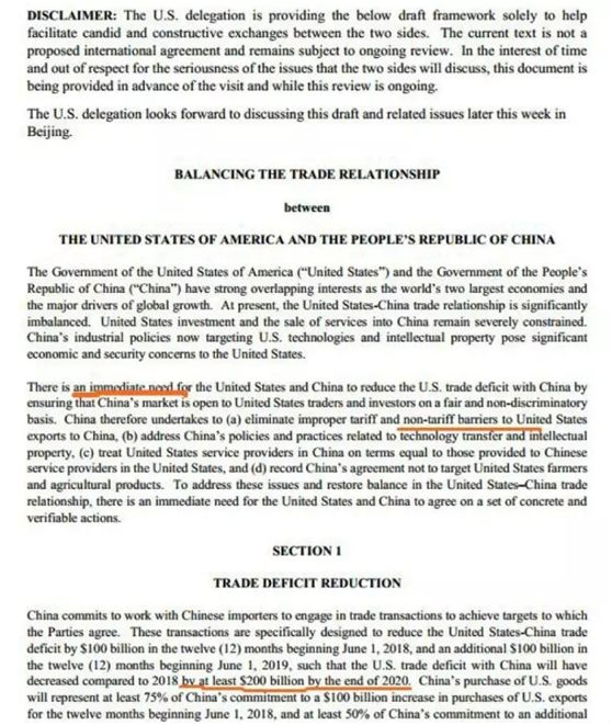 2. 中国必须在截至2020年的2年内,减少对美国的2000亿美元贸易逆差