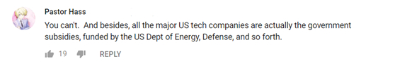 ▲“啊哈哈哈笑死我了。中国必须做这,中国必须做那,西方提出这种要求已经200多年了”▲“你做不到的。而且事实上,美国所有主要的科技公司都是政府补贴,由美国能源部、国防部等等资助的。