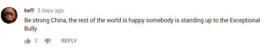 ▲“中国一定要变强,世界上的其他国家都很高兴能有人站出来对抗这个特殊的欺凌者。”