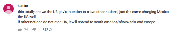 ▲“这完全说明了美国政府正试图奴役其他国家,就和让墨西哥建美国墙是一样的。如果别的国家不阻止美国,那么这将会扩散到南美、非洲、亚洲和欧洲。”