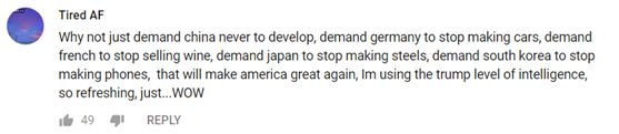 ▲“为什么光让中国停止发展?干脆让德国停止制造汽车,让法国人停止卖酒,日本人停止生产钢材,韩国人停止制造手机……这才能让美国重新伟大!”