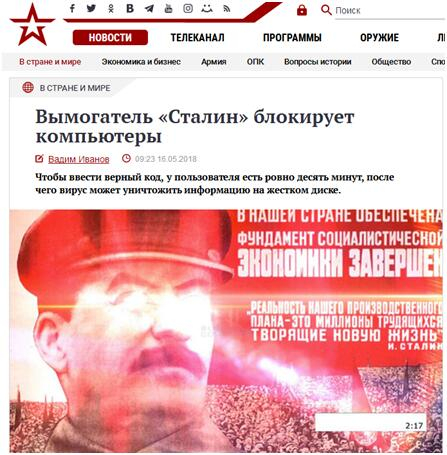眼睛发光的斯大林?不要以为这是一款新出的电脑游戏。严肃地说,这是一款名为“斯大林封锁者(StalinLocker)”或“斯大林尖叫者(StalinScreamer)”的勒索病毒。