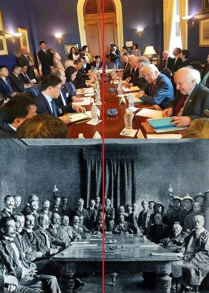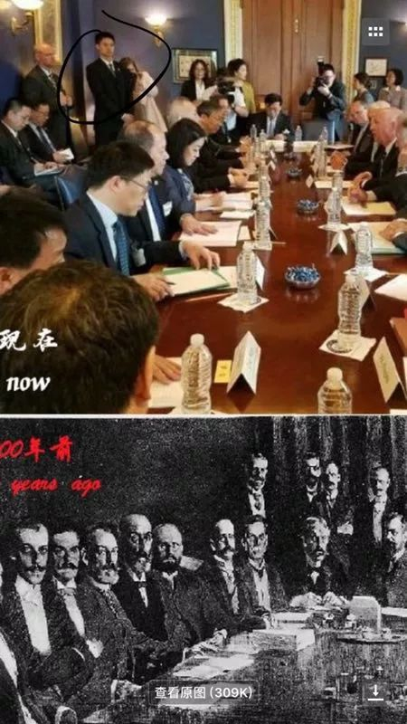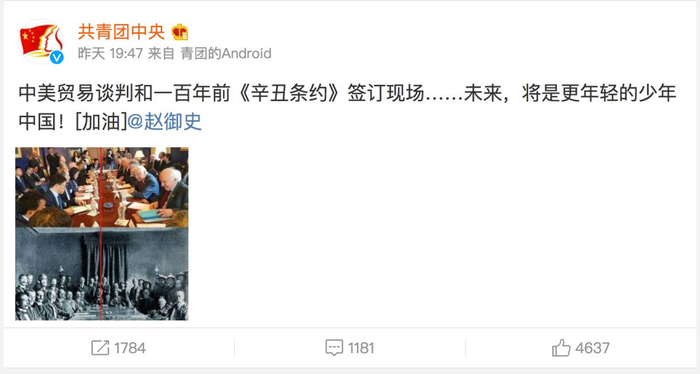 在微博中,@共青团中央 援引博主@赵御史 的图片,并配文称,中美贸易谈判和一百年前《辛丑条约》签订现场……未来,将是更年轻的少年中国!