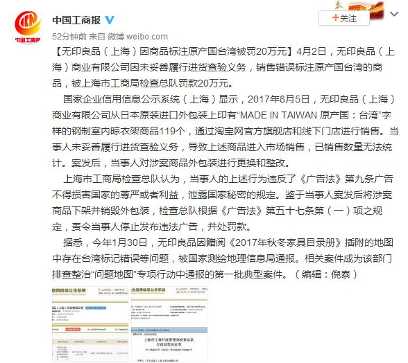 据中国工商报官方微博通报,4月2日,无印良品(上海)商业有限公司因未妥善履行进货查验义务,销售错误标注原产国台湾的商品,被上海市工商局检查总队罚款20万元。