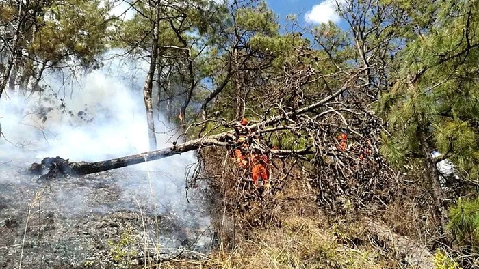 火灾发生在海拔2200米的半山腰上,火场主要为云南松林,地表杂草丛生,坡度30-40度,在高温时段以及2-3级西南风作用下,火灾呈稳进地表火伴有树冠火,迅速向东北方向蔓延。现场看到,火场浓烟冲天,部分树冠火高达6-8米,远在2公里之外的公路边都能听到噼噼啪啪的响声。