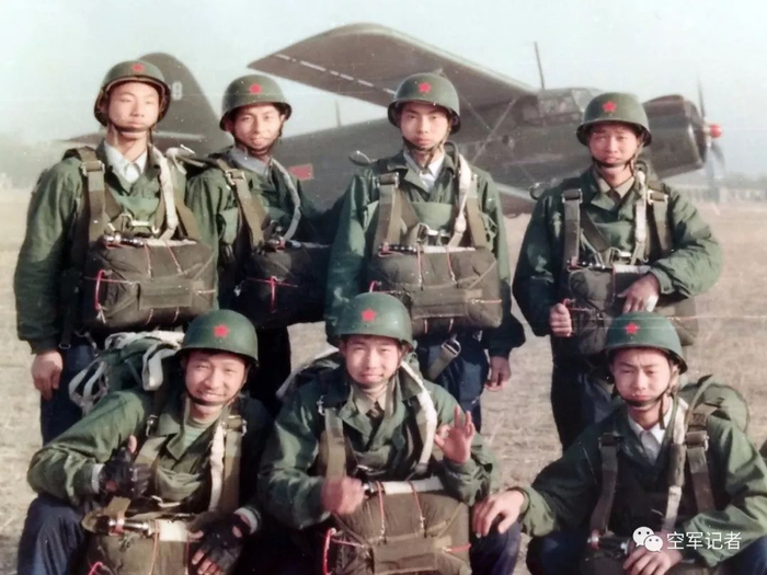 △刘传健(后排右二)在部队进行跳伞训练。