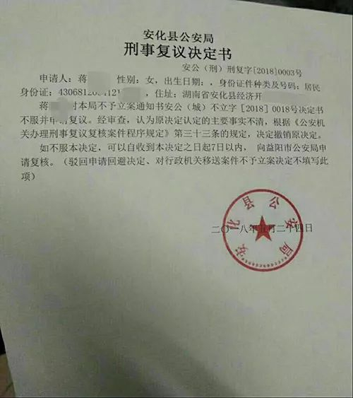5月24日,芬芬家人告诉澎湃新闻,已收到安化县公安局的复议决定书。这份“安公(刑)刑复字【2018】0003号”刑事复议决定书,落款时间为5月24日。该决定书显示,安化县公安局决定撤销此前作出的不予立案决定书,“经审查,认为原决定认定的主要事实不清。”