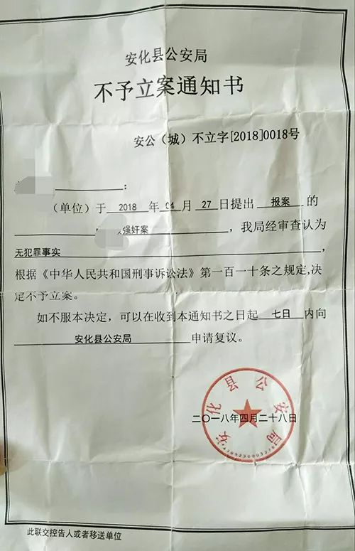 安化县对此次报案作出不予立案决定,是在报案的第二天的4月28日。澎湃新闻记者注意到,文号为“安公(城)不立字【2018】0018号”的《安化县公安局不予立案通知书》显示,对于4月27日关于一男子涉嫌强奸的报案,安化县公安局经审查认为“无犯罪事实”,故根据刑事诉讼法的有关规定不予立案。