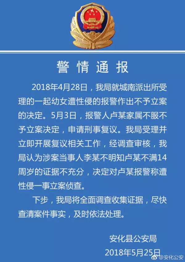 @安化公安 5月25日消息,2018年4月28日,我局就城南派出所受理的一起幼女遭性侵的报警作出不予立案的决定。5月3日,报警人卢某家属不服不予立案决定,申请刑事复议。我局受理并立即开展复议相关工作。经调查审核,我局认为涉案当事人李某不明知卢某不满14周岁的证据不充分,决定对卢某报警称遭性侵一事立案侦查。