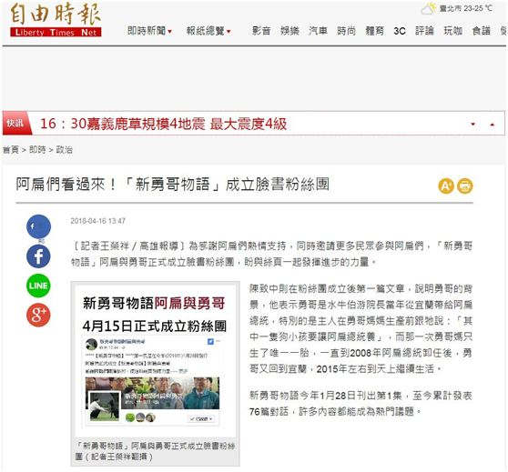 ▲台湾媒体认为,“新勇哥物语”走上脸书,是“不甩蔡英文”。