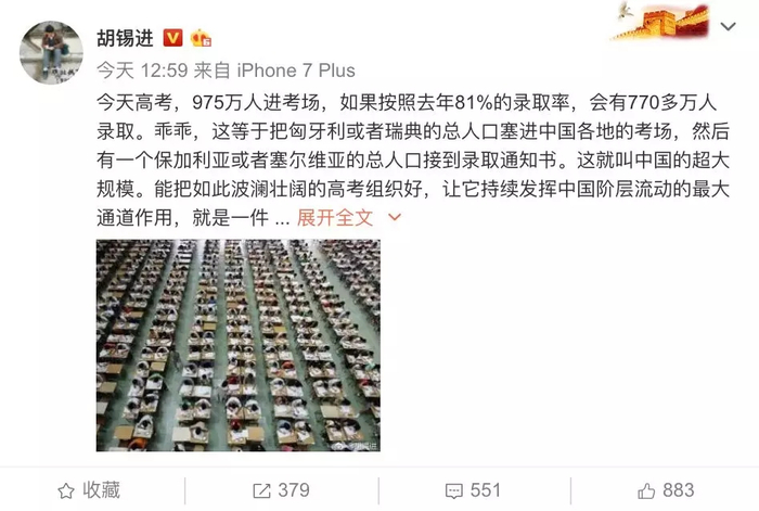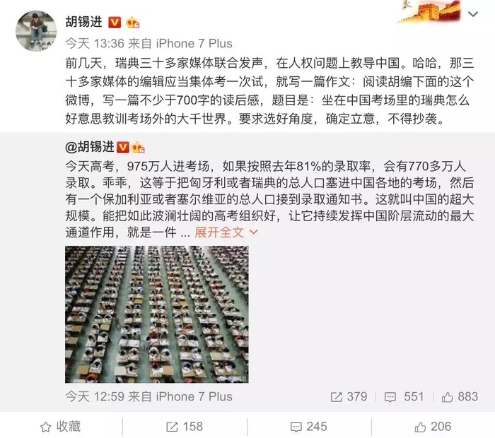 今天高考,975万人走进考场,预计会有770多万人被录取。环球时报总编辑胡锡进今天中午发微博感慨,这相当于把瑞典总人口塞进中国各地考场,然后让塞尔维亚总人口接到录取通知书。要知道,瑞典是在人权上批评中国最多的欧洲国家之一,上周刚有30多家瑞典媒体联合发声,教导中国。于是,老胡借中国高考拿瑞典开涮了。