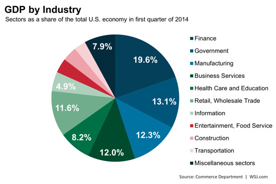图表3来源于美国商务部。2014年一季度美国GDP中各产业所占的比重。其中,金融占19.6%,政府占13.1%,制造业占12.3%,商业服务占12.0%,健康和教育占8.2%,零售业和批发占11.6%,信息产业占4.9%。 (央视记者 曹卿云)