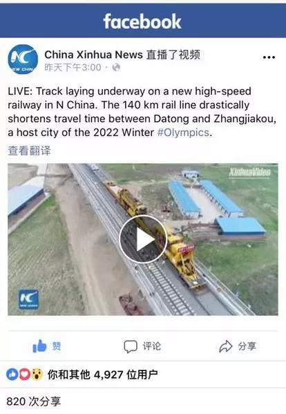 6月21日15时,一条中国高铁铺轨的直播视频通过新华社海外平台(New China)向全球直播,迅速在YouTube、Twitter、Facebook等海外社交平台引起热烈反响,仅在Facebook平台就获得160万浏览量,互动量约24万,约1.8万人点赞。