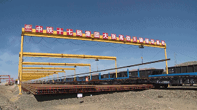 施工时,单条30吨重、500米长的钢轨可以双轨同时铺设。