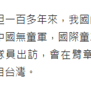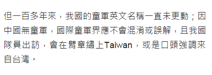 环环查到岛内绿媒《自由时报》2017年的一则报道,“一百多年来,我国(台湾)的童军英文名称一直未更动;因中国(大陆)无童军,国际童军界应不会混淆或误解,且我国队员出访,会在臂章绣上Taiwan,或是口头强调来自台湾”……