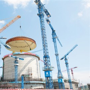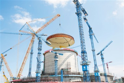 这是中国第三代核电技术品牌“华龙一号”示范工程穹顶的吊装现场,其操作误差控制在2毫米范围内的吊装绝技不仅征服了现场观众,而且让远在大西洋之滨的英国同行也赞叹不已。通过示范工程建设的此次重大进展,他们对即将落户英国布拉德韦尔B核电站的中国“华龙一号”更加充满信心。