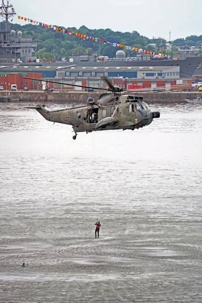 6月16日,在德国基尔军港,德国海军航空兵的一架直升机演示海上低空救援。新华社记者王勍 摄
