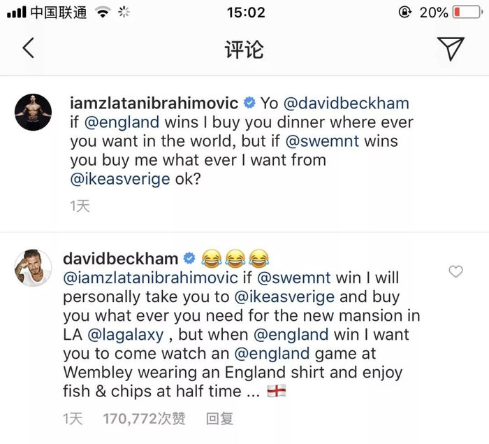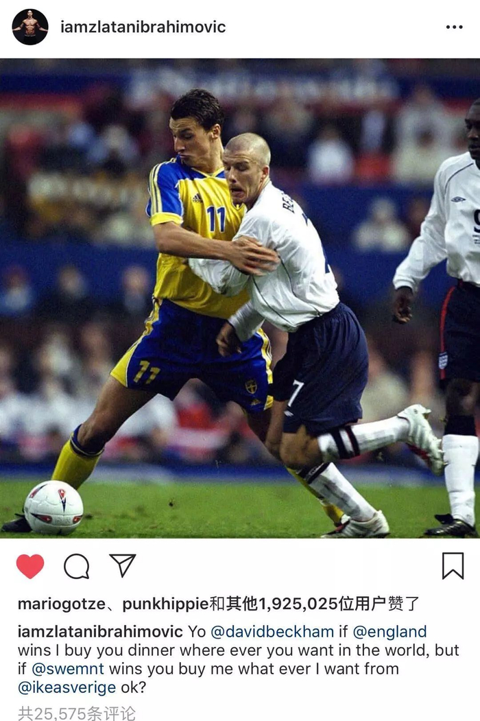 赛前,瑞典传奇球星伊布在社交媒体上发了一张与“世界足球先生”贝克汉姆的合照,并写道:“如果英格兰赢了,我请你吃一顿晚餐,全世界随便挑,如果瑞典赢了,你给我买任何我想要的宜家家具,成交?”