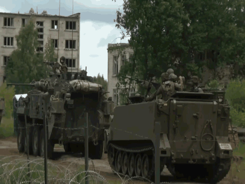 “世界杯”期间,以美国为首的北约19国军队在波罗的海沿岸举行了代号“军刀打击2018”的大规模军演,1.8万兵力参演,明显是针对俄军进行。其中美海军陆战队还与意大利、加拿大等国陆军在拉脱维亚进行城市战突袭演练。图为加拿大陆军LAV III轮式装甲车掩护M113装甲运兵车。