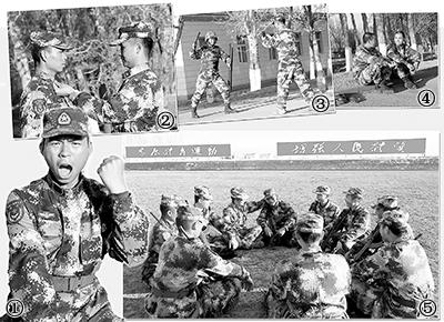 图①:列兵张宏岗;图②:郝磊为张宏岗整理着装;图③:郝磊帮张宏岗拍摄训练照,传给他的父母;图④:与陈康谈心时,张宏岗表示“一定好好干”;图⑤:和大家打成一片,张宏岗变得更加开朗乐观。