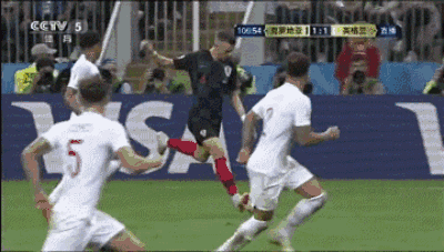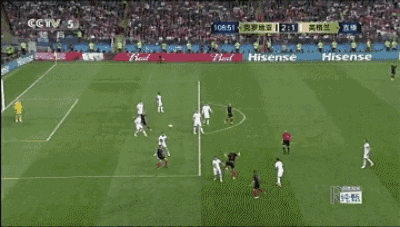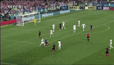 比赛第68分钟,克罗地亚追平比分。拉基蒂奇左侧大范围转移,弗尔萨利科右路斜传,佩里希奇摆脱特里皮尔,距门7米处左脚伸到沃克头顶外脚背弹射入左下角,1-1。