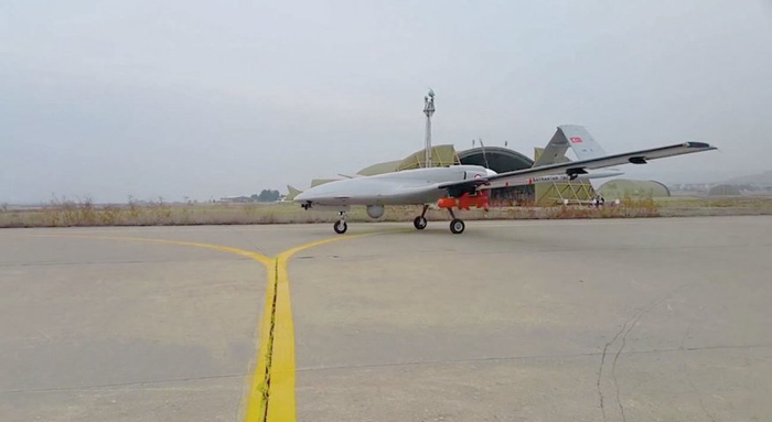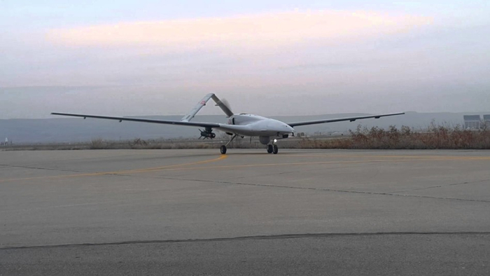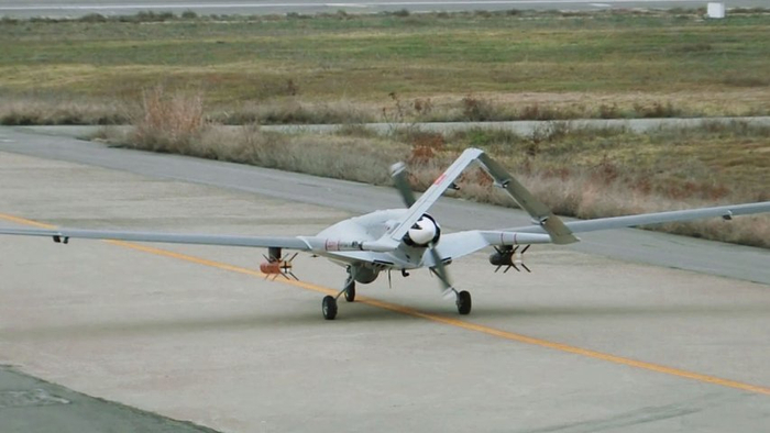 挂载导弹的Bayraktar TB2攻击型无人机准备滑跑起飞。