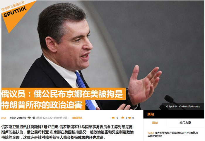 另据俄罗斯卫星网消息,俄国家杜马国际事务委员会主席列昂尼德∙斯卢茨基对此表示,俄罗斯公民布蒂娜在美被拘是又一起政治迫害和凭空制造政治事端的企图,这或许是针对俄美领导人峰会积极成果的预先准备。