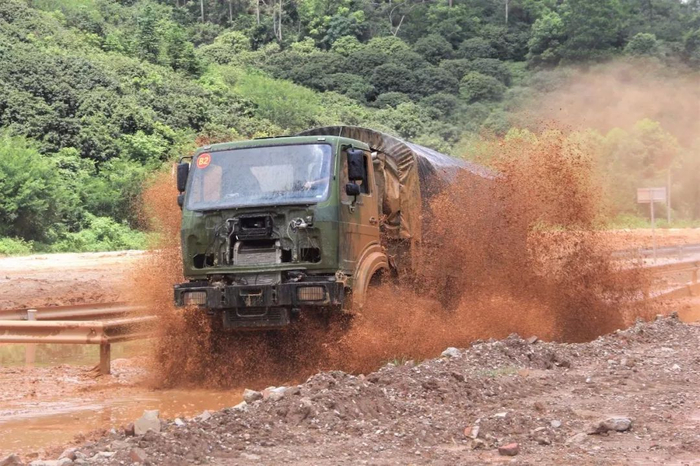 ▲运输车驶入水障碍路段掀起水浪