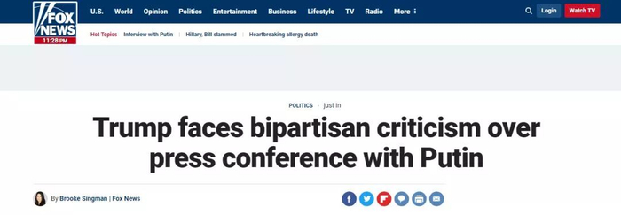 并且,特朗普在发言时质疑本国情报单位的结论。他告诉记者,虽然我很信任我们的情报人员,但普京“极为坚决且强而有力地否认(此事)”,事后还推文道:“我们不能固守过去,身为全球两大核武国,我们必须和睦相处!”
