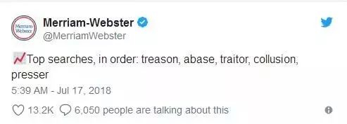 根据辞典出版商韦氏公司(Merriam-Webster)的推文,“叛国”(treason)、“卖国贼”(traitor)和“勾结”(collusion)等词语成了人们查找频次最高的词语。⬇️