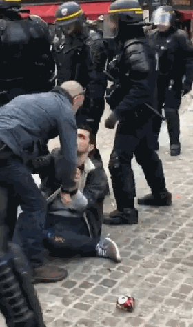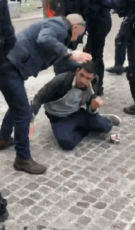 据《费加罗报》报道,2018年5月1日,在巴黎市中心第五区,年轻的示威者与法国防暴警察部队之间爆发冲突,事件现场的视频被一位名叫布哈夫(Taha Bouhafs)的网友传至推特。视频中,我们看到警方介入控制场面,但是,突然,一个不太像警察的男子出现在视频中,他头戴着头盔,身穿灰色兜帽衫,殴打着一名已经被警察制服在地上的男子。
