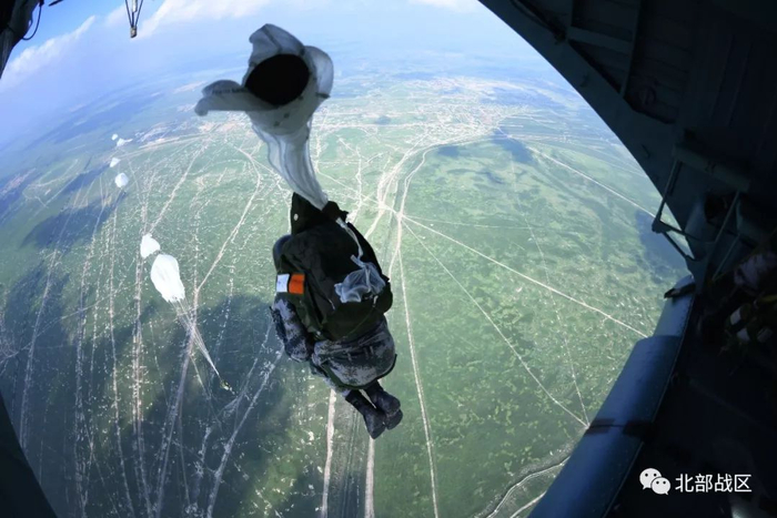 “跳!”战鹰到达预定空域,投放员果断下令,只见特战队员们三步离机,拥入了蓝天的怀抱,洁白的伞花绚烂地绽放在碧空当中,那一幕美得像画。