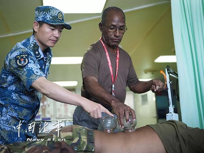 ▲对于巴新国防军中医安德鲁准尉而言,两度到中国留学,曾在海军军医大学学习中医。目前在陶洛马军医院从事中医诊疗工作,推动了中医在巴新军队乃至全国的发展和传播。这次与当年的中国带教老师杨延龙一起为巴新国防军官兵诊疗。