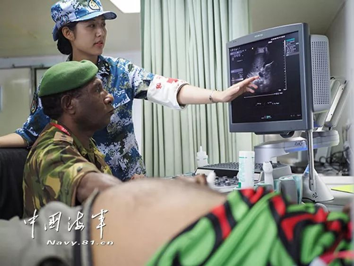▲陶洛马军医院军医克里斯托弗上尉在和平方舟医生赵佳琦的指导下,对民众进行超声检查。克里斯托弗曾在海军军医大学附属长征医院超声科实习,他在毕业论文里,特别致谢带教老师赵佳琦。