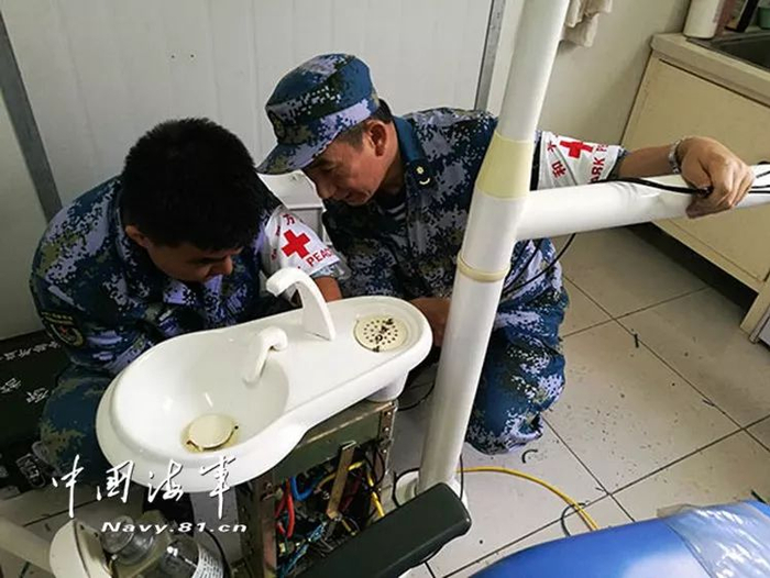 ▲和平方舟设备维修分队赴盖瑞胡医院进行牙科设备维修。