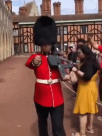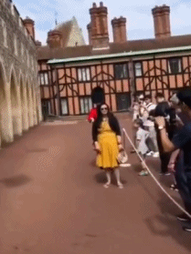 啊?女游客温莎城堡越界微笑拍照 被皇家侍卫推了个趔趄(视频)
