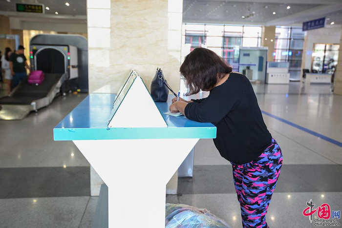 一名蒙古国旅客正在填写出境卡。中国网记者 伦晓璇 摄