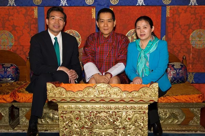 ▲资料图片:2017年1月23日,中国驻印度大使罗照辉(左)和夫人江亦丽参赞(右)在不丹首都廷布拜会不丹第四世国王吉格梅·辛格·旺楚克(中)。(中国驻印度大使馆网站)