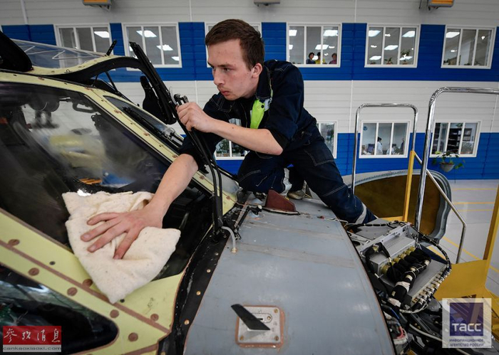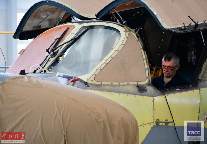 技工在卡-52座舱内进行安装作业。