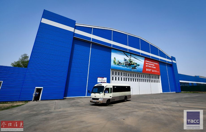 图为俄罗斯联合航空制造集团公司旗下的“进步”武装直升机总装车间外景,可见卡-52的宣传图。