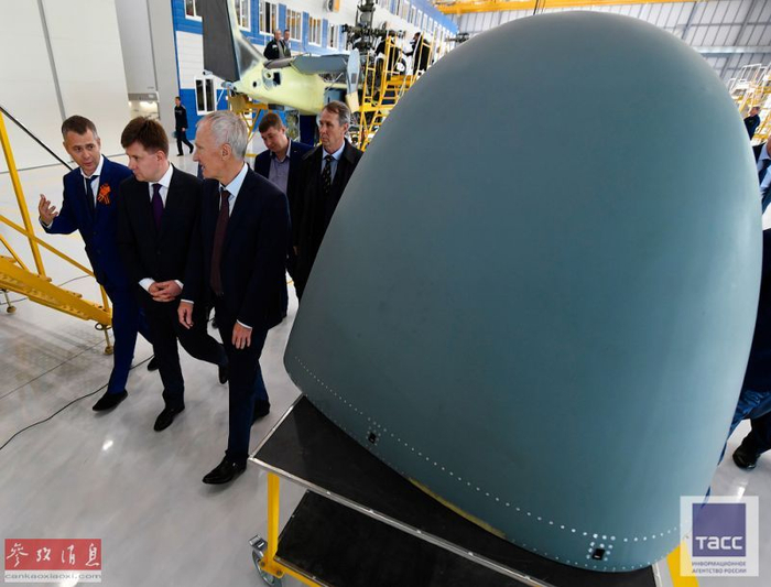 俄政府高层人员视察车间,旁边是卡-52的机头雷达罩部件。