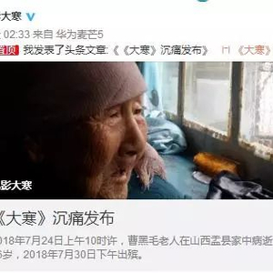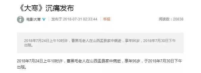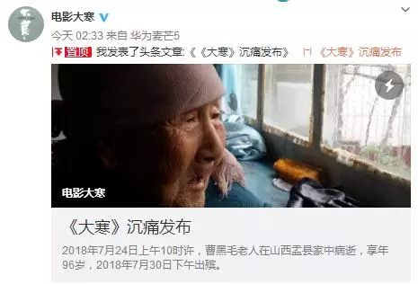7月31日凌晨2:33分,电影大寒官方微博发布了题为“《大寒》沉痛发布”的文章,文章称,2018年7月24日上午10时许,曹黑毛老人在山西盂县家中病逝,享年96岁,2018年7月30日下午出殡。