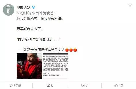 31日6点46分,电影大寒官方微博再发布一篇导演张跃平追悼曹黑毛老人的文章,“这是难眠的夜,这是早醒的晨。曹黑毛老人走了。‘我宁愿相信您出远门了……’”