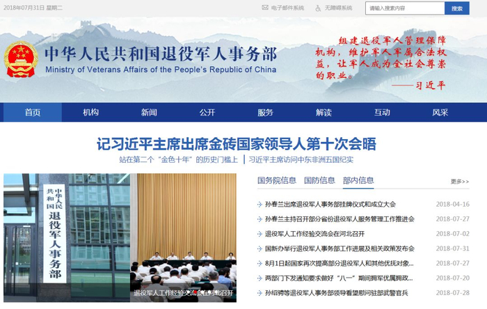 中华人民共和国退役军人事务部门户网站于7月31日上线运行,网址为www.mva.gov.cn。网站开设机构、新闻、公开、服务、解读、互动、风采等频道,秉承“维护军人军属合法权益,让军人成为全社会尊崇的职业”这一宗旨,向全社会宣传退役军人为党、国家和人民牺牲奉献的精神风范和价值导向,提供“互联网+退役军人服务”,打造退役军人工作信息公开、政策发布解读和及时回应关切的第一平台。
