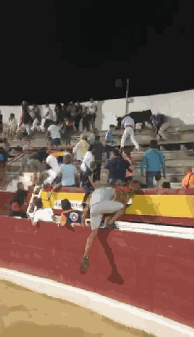 看台上的人纷纷躲避,斗牛在看台上冲撞人群,工作人员爬上看台控制斗牛。(图片来源:推特)